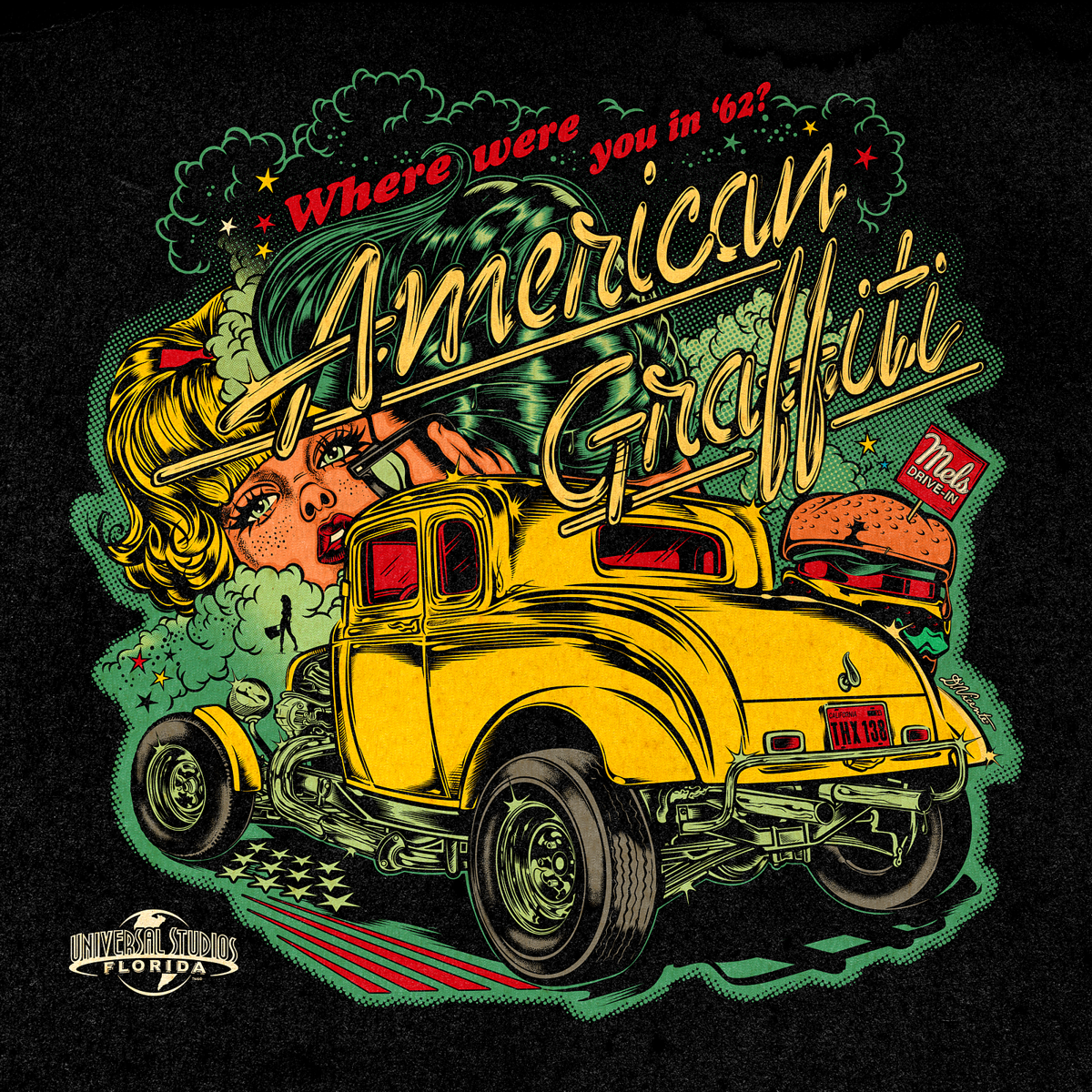 This illustration inspired by American Graffiti, George Lucas's classic film, captures the essence of 1960s America. At the center is the iconic yellow Hot Rod, symbolizing freedom and rebellion, evoking the spirit of youth and street racing. With its retro-vintage style, this illustration celebrates the unique aesthetic and atmosphere of a cult film, inviting fans to relive an era where cars and music defined a generation.