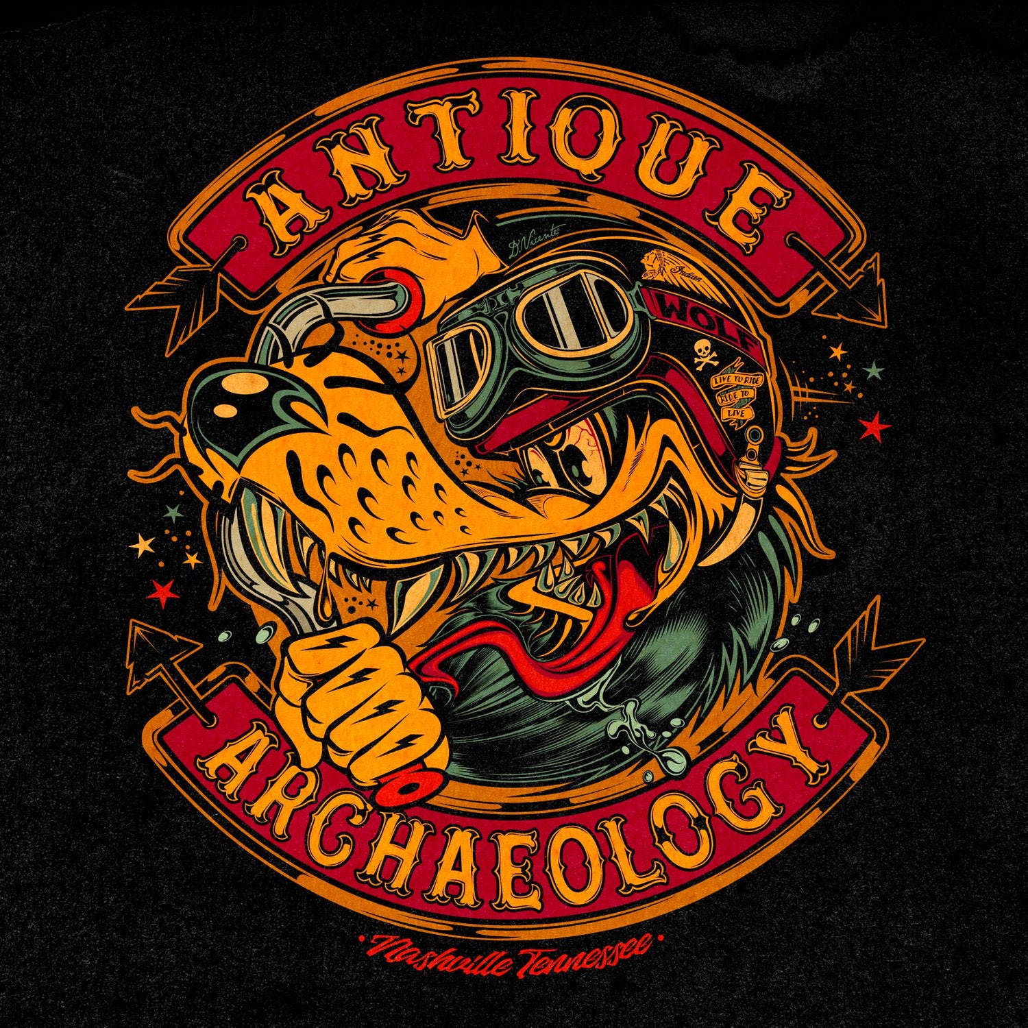 ANTIQUE ARCHAEOLOGY is a bold and energetic illustration inspired by the vintage cartoon style of Tex Avery. It features a bearded wolf with a wild look, mouth wide open, tongue hanging out, and sharp, jagged teeth forming a mischievous grin. His biker persona is emphasized by a motorcycle helmet adorned with stickers paying tribute to the legendary Indian Motorcycles, with a pair of goggles securely fastened on top...