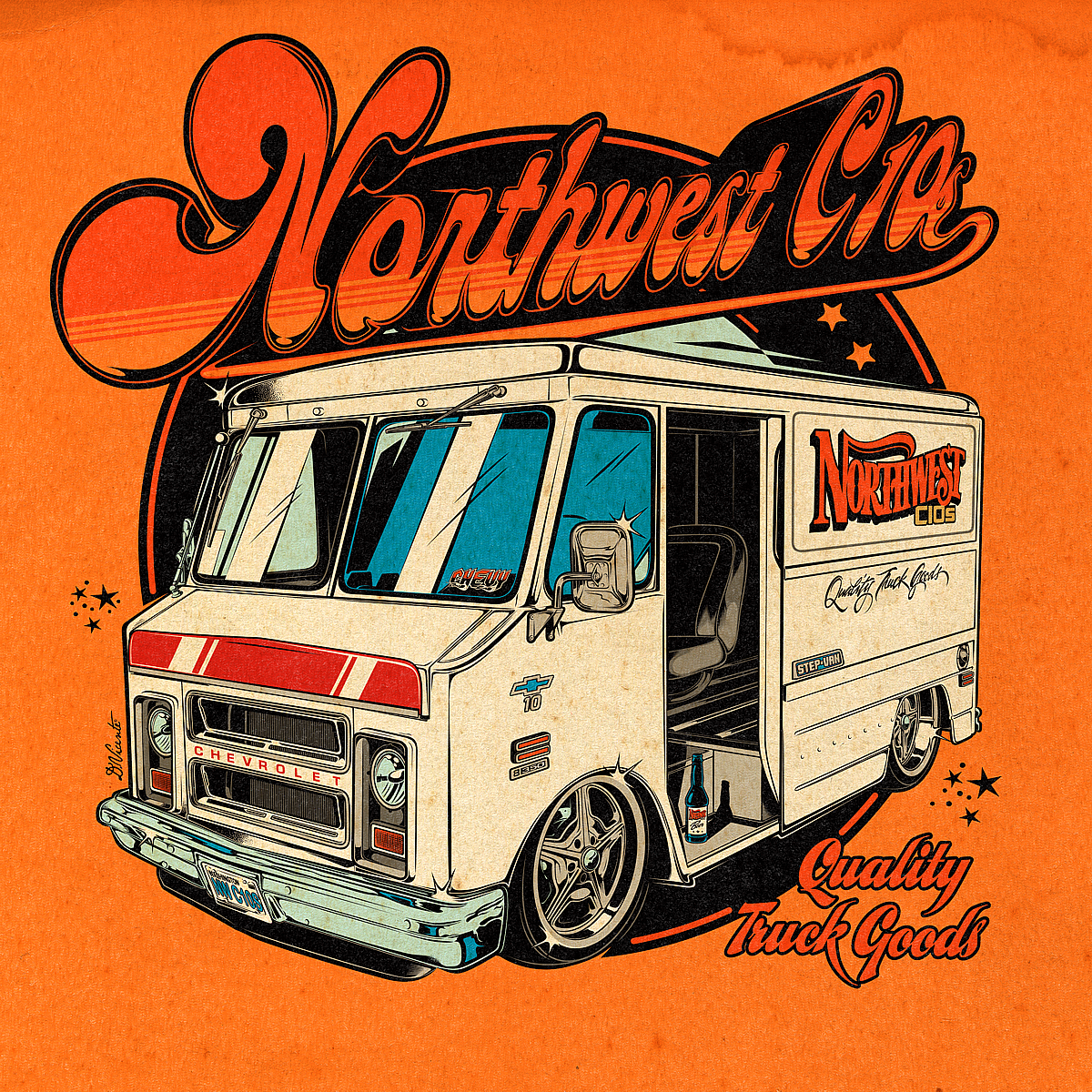 Hello everyone, today I am excited to show you my latest design project for NORTHWEST C10S. Featuring our latest illustration of a 1972 Chevy P10 VAN TRUCK, created from a photo provided by its proud owner. This T-Shirt design was made for the American brand NORTHWEST C10's, in a retro vintage style reminiscent of the 70'S !!! Check out more designs in our portfolio Dribble and thank you so much for your interest in my illustration work.