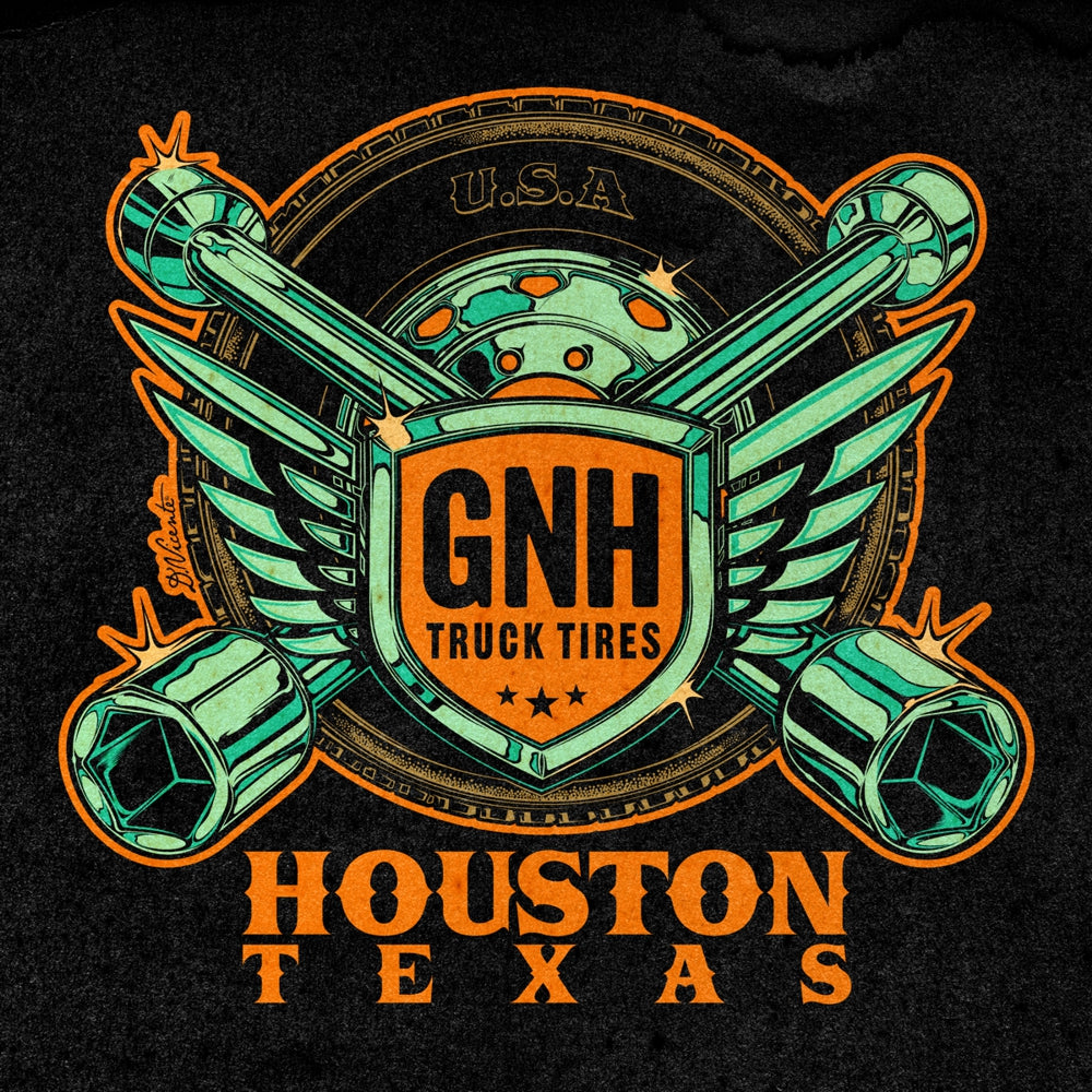 Hello everyone, today I'm excited to show you my latest design project. So what is it all about? I had the privilege of collaborating with GNH TRUCK TIRES company, based in Houston, Texas, USA, to create a unique T-shirt design.They already had a logo, consisting of a magnificent coat of arms decorated with two small wings and the three letters GNH. My job was to reinterpret this logo in my own way, adding elements like a massive truck wheel, a disassembly tool and a selection of fonts, all in an attractive visual composition...
