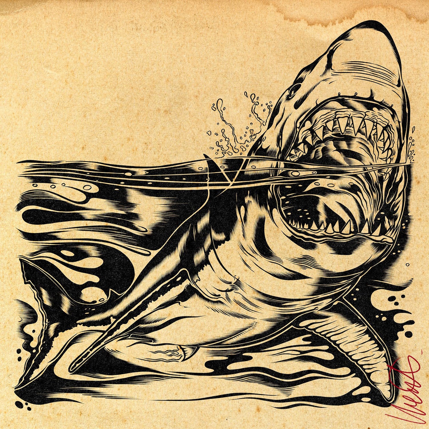 The final version of my illustration for the film JAWS, created for Universal Studios. You can see a boat sinking, a clear sign that the shark has likely already attacked. The red tones evoke the violence of the attack, adding to the tension of the scene. The dark details, shades of red, and overall atmosphere aim to capture the essence of this cult classic. The year 1975, reminds us that Steven Spielberg's masterpiece has since become an iconic piece of cinematic history.